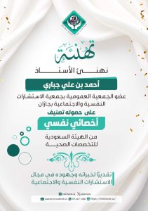 بكل الفخر والاعتزاز ، تتقدم جمعية الاستشارات النفسية والاجتماعية بجازان وكافة منسوبيها بخالص التهاني والتبريكات لعضو الجمعية العمومية الأستاذ أحمد بن علي جباري بمناسبة حصوله على تصنيف “أخصائي نفسي” من هيئة التخصصات الصحية و تسأل الله له دوام التوفيق والتميّز، وأن يجعل هذه الخطوة المباركة عونًا له في خدمة مجتمعه ووطنه، ومزيدًا من العطاء في ميدان الصحة النفسية والاجتماعية.