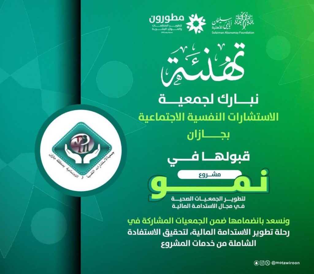 جمعية_الاستشارات_النفسية_والاجتماعية_بجازان #جازان #تهنئ الفريق المشارك والممثل للجمعية بهذا الانجاز الذي يعكس الالتزام والتعاون في تحقيق الاثر المستدام حيث تم اختيار جمعية الاستشارات ضمن أول عشر جمعيات قبلت للاستفادة من خدمات المشروع الشاملة